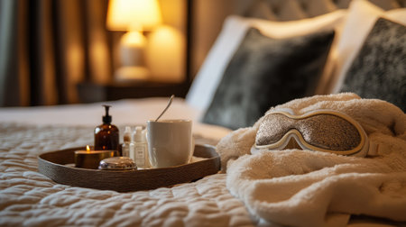 Eye mask and a plush robe on a hotel bed, styled with a room service tray for a luxury vibe