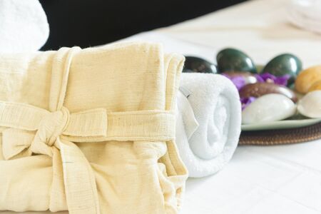 Close up view of spa table with massage stone and towels, beauty treatment and wellness background