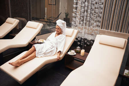 Beautiful elegant pretty female with towel on her head enjoy beauty weekend in resort