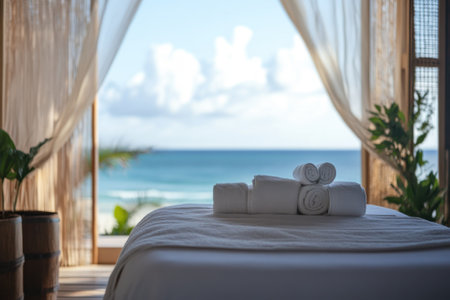 Towels neatly arranged on a treatment table with a stunning ocean view through open curtains.