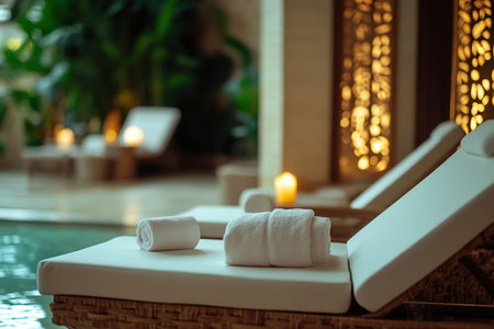 A tranquil spa setting featuring plush lounge chairs and rolled towels beside a softly lit pool area.