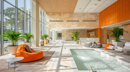 Imagine a spacious lobby featuring a central swimming pool, creating a serene and inviting atmosphere