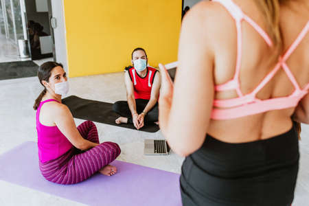 Group of latin people in class of yoga wearing facemask in a coronavirus pandemic in Latin America