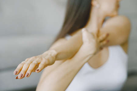 Active woman doing stretching exercises in the room while sitting on yoga mat.
