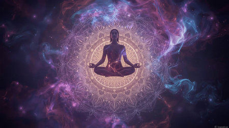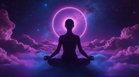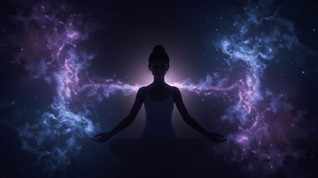 A serene silhouette of a person in lotus position represents meditation and spiritual connection against the backdrop of a cosmic universe.