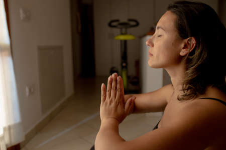 Woman meditating and relaxing in yoga studio