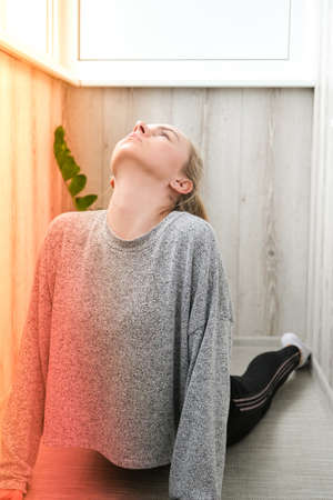 Young millennial blonde woman doing yoga exercise stretching fitness at balcony home. Mindfulness meditation.