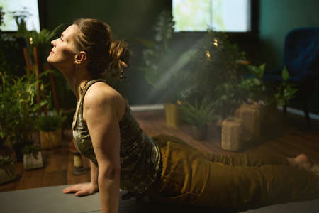 Cheerful pretty woman practicing yoga at home