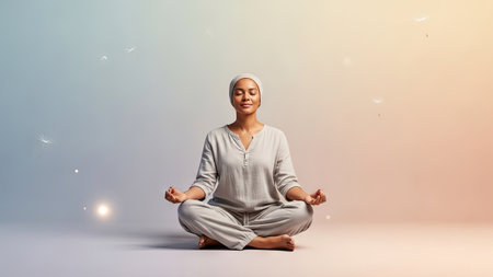A woman sits in a meditative lotus position, eyes closed, against a soft, gradient background. She wears light-colored clothing. The composition is centered, with subtle lighting adding depth. This image is suitable for various commercial purposes, including wellness and lifestyle content.