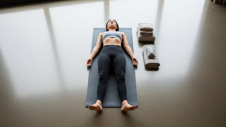 Top view of a fit attractive woman lying in a yoga mat with her eyes closed. Hispanic woman doing a corpse pose and relaxing