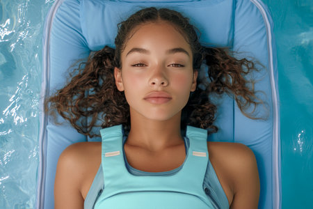 Serene young woman wearing a life vest, floating and relaxing in clear blue water