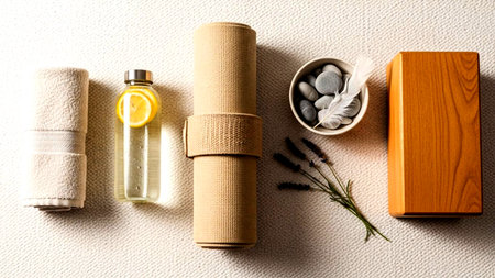 A serene collection of yoga and wellness essentials, including a mat, block, essential oils, palo santo, and soft towels, arranged for a peaceful self-care routine.