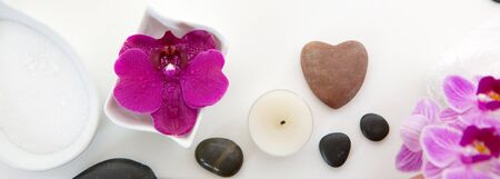 Spa setting with pink orchids, black stones and bath salts on wood background.