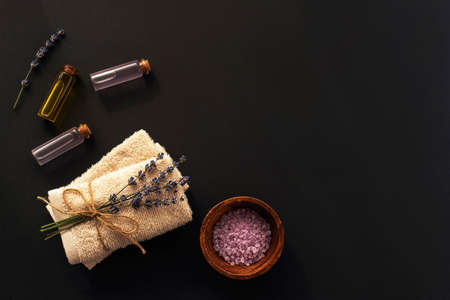 Sea salt, towels with lavender blossom and essential oils on black background, top view, flat lay, copy space. Aromatherapy, spa and wellness concept.