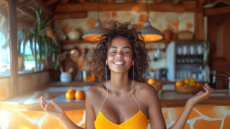 A young woman enjoying music in a cozy kitchen on a bright morning. She is smiling and relaxed, exuding a sense of happiness and peace.