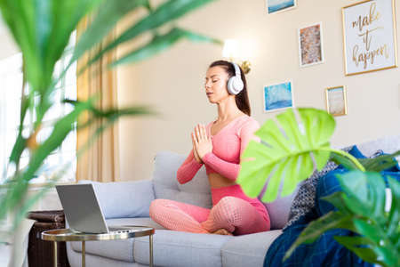 Close up photo of beautiful woman meditating at home and doing om pose.
