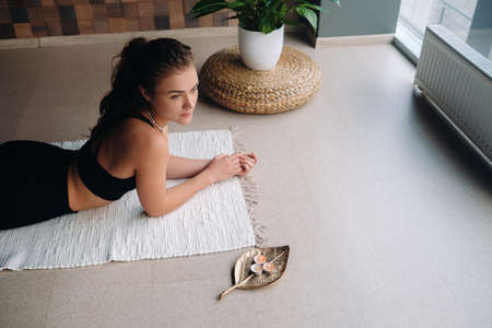 Young woman lies on floor after her workout and looking down. Female athlete taking rest after fitness training