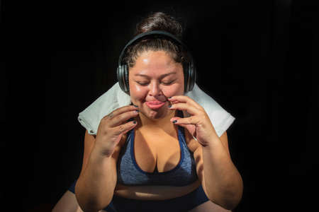 portrait of obese young woman listening to music ready to start fitness workout, imagining food