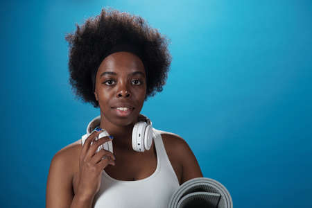 Young sportswoman with headphones and rolled mat standing in front of camera