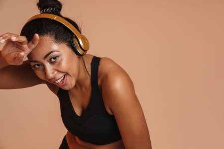 Joyful african american woman in headphones resting while working out isolated over beige background