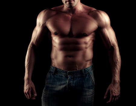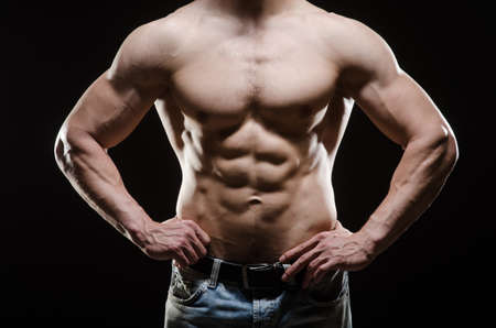 Shirtless male torso over dark background. Shape male abdomen muscles.