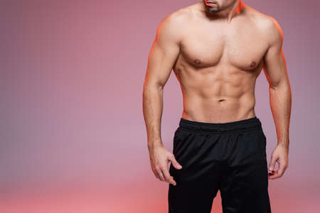 cropped view of shirtless man with muscles posing on pink and gray
