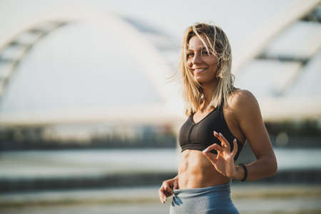 Smiling fitness woman showing her perfect abs muscles while working out near the river.
