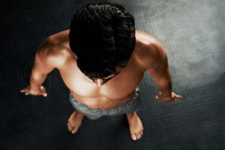 Ripped and ready. High angle shot of a muscular young man standing on a gray floor.