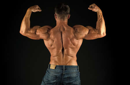 Exercises for back. Bodybuilder perfect shape rear view. Strong bodybuilder flexing arms muscles black background. Fit bodybuilder showing muscular body. Professional coach demonstrate achievements