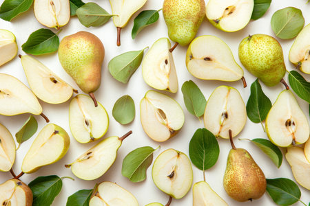 Artistic display of pear halves and slices surrounded by fresh green leaves on a white background