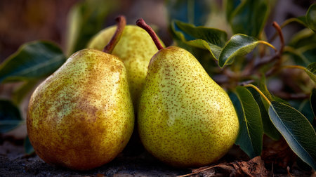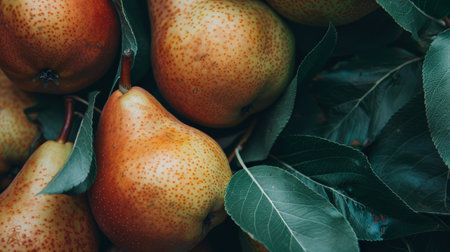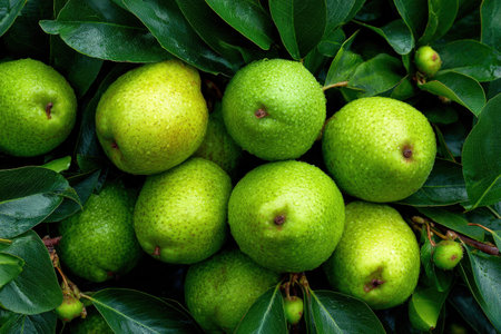 Lush green pears surrounded by rich foliage, highlighting their vibrant colors and natural textures, ideal for promoting healthy eating and organic lifestyle themes