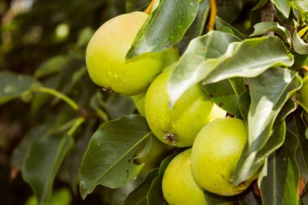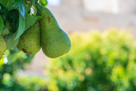 Organic, ripe pears in the summer garden, autumn harvest, Close up view of Pears grow on pear tree branch with leaves under sunlight, Selective focus on pears.