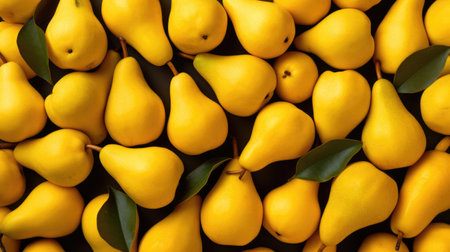 Rows of pears on a yellow background with copy space. Generative AI
