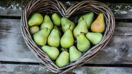 A charming arrangement of fresh green pears nestled in a heart-shaped wicker basket, resting on a weathered wooden surface, showcasing nature's bounty.