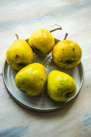 Organic pear fruits on the vintage plate on wooden background with copyspace