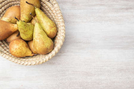 Ripe juicy pears in wicker basket on wooden table, top view, harvest for delicious juice