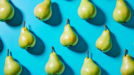 Green pears arranged in a grid pattern on a blue background, vibrant and minimalist concept