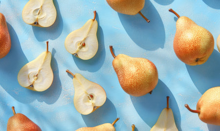 Pears scattered on a light pastel background