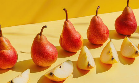 Whole and sliced pears on a light yellow surface