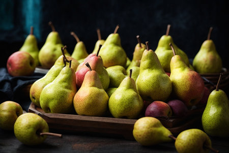 Ripe pears in a wooden tray on a dark background.