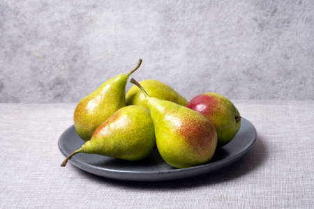Green pears with red sides in grey plate on grey background