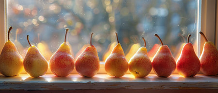 A neat row of ripe pears lined up on a window sill, bathed in natural light.