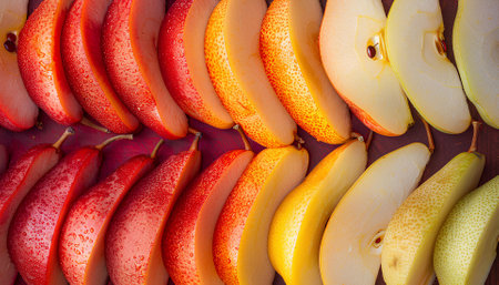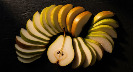 Sliced pears arranged in semi-circle on dark surface with dramatic lighting
