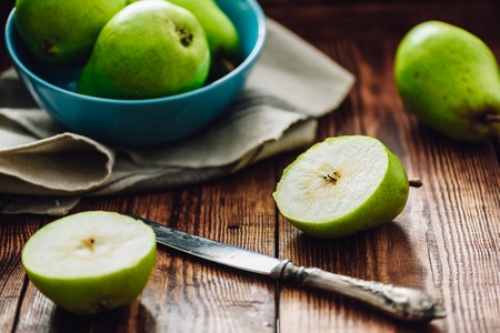 Sliced Pear with Knife and Some Pears on Background.
