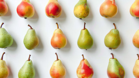 Several pears are arranged in a row, sitting closely next to each other. The pears vary slightly in size and color, creating a visually appealing display.