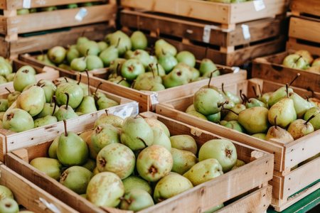 Fresh ripe pears in wooden crates at warehouse with soft natural lighting, perfect for food ads