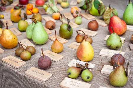 Different species of pears, on a table. Varieties of fruits and biological diversity concept.