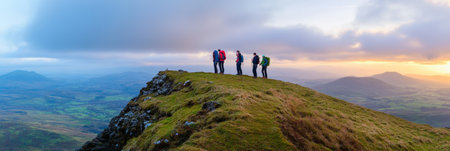 Four hikers with backpacks standing on a grassy mountain summit, enjoying a breathtaking sunset view over rolling hills and illuminated valleys below