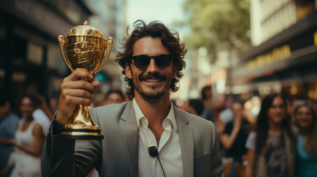 A vibrant image capturing the moment of celebration as a trophy is lifted high amidst a cheering crowd, symbolizing victory and achievement in an outdoor setting.