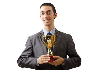 successful man in suit hold champion cup s business reward isolated on white, success.
